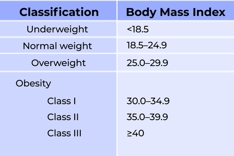 BMI is a screening tool for overweight and obesity (see the following table). BMI is calculated as a person’s body weight (in kilograms) divided by the square of their height (in meters).