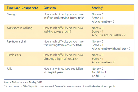 People whose SARC-F scores suggest the presence of sarcopenia can be assessed further with tests of mobility and strength, such as the chair–stand assessment for lower extremity strength (time to complete 5 chair stands of ≥15 seconds indicates low muscle strength); hand-grip strength using dynamometers (readings of <27 kg for men or <16 kg for women indicate low grip strength); and asking about the person’s ability to climb 10 stairs (Ibrahim et al., 2018).